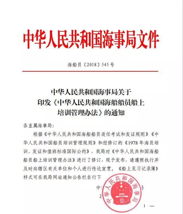 各直屬海事局: 根據(jù)《中華人民共和國海船船員適任考試和發(fā)證規(guī)則》《中華人民共和國船員培訓(xùn)管理規(guī)則》和經(jīng)修訂的《1978 年海員培訓(xùn)、發(fā)證和值班標準國際公約》,我局對《中華人民共和國海船船員船上培訓(xùn)管理辦法》進行了修訂,現(xiàn)予發(fā)布,請遵照執(zhí)行并及時向轄區(qū)有關(guān)單位和個人進行傳達宣貫。《船上見習(xí)記錄簿》樣式可在我局網(wǎng)站通知公告欄自行下載。