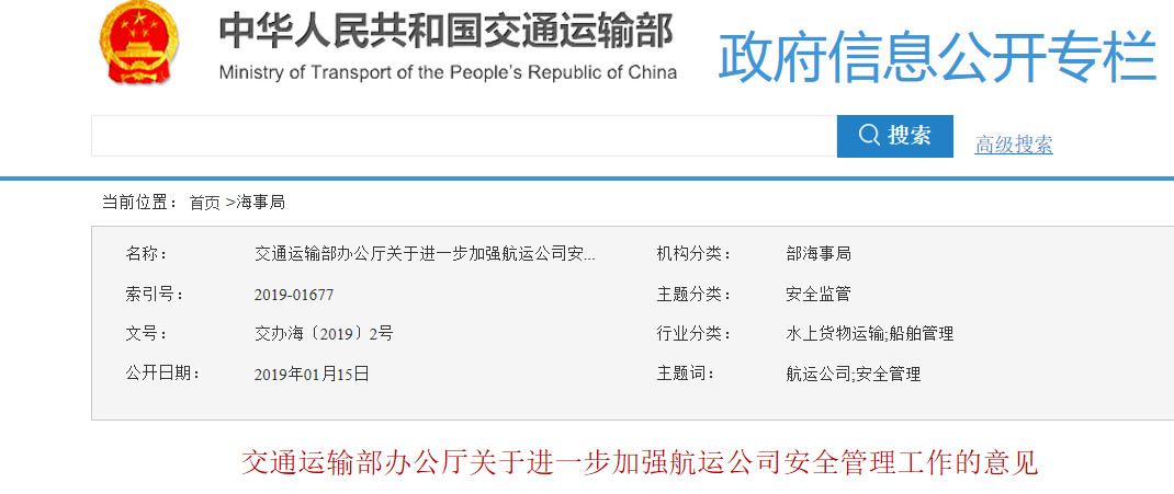 交通運輸部日前發布《關于進一步加強航運公司安全管理工作的意見》(以下簡稱《意見》),要求各級水路運輸管理部門和海事管理機構,嚴厲打擊船舶“假登記”“假光租”和國內水路運輸“掛靠”經營、船舶管理公司“代而不管”、內河船舶非法從事海上運輸等違法違規行為。